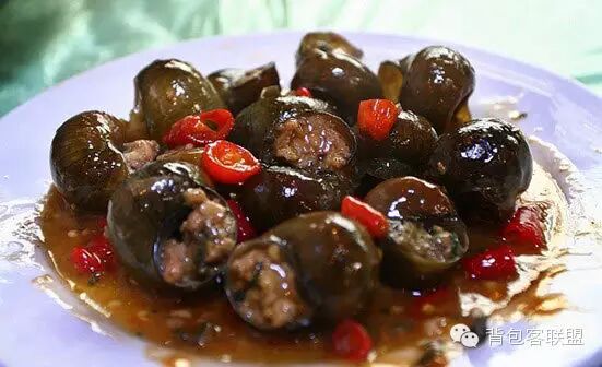 桂林最负盛名的“十八酿”,即十八种酿菜。所谓“酿菜”,是当地一种特色吃法:把各种调料加入到肉馅里,然后填入不同蔬菜或壳类做成的“外衣”中,或蒸,或焖,熟而成“酿”。具体有田螺酿、豆腐酿、柚皮酿、竹笋酿、香菌酿、蘑菇酿、南瓜花酿、蛋酿、苦瓜酿、茄子酿、辣椒酿、冬瓜酿、香芋酿、老蒜酿、蕃茄酿、豆芽酿、油豆腐酿、菜包酿。