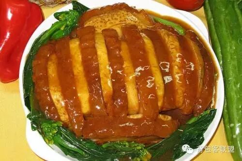 荔浦芋扣肉是传统宴席名菜,采用正宗桂林荔浦芋、带皮五花肉、桂林腐乳和各式佐料。将带皮五花肉和切块荔浦芋分别过油炸黄,然后将五花肉块皮朝下,与芋块相间排放碗中蒸熟,翻扣入另一盘中即成。特点是色泽金黄,芋片肉片松软爽口,浓香四溢。具有清热祛火、滋润肤色功能。
