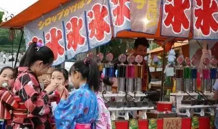 祭典上有许多摊贩贩卖美食如:炒面(焼きそば)、烤甜玉米、巧克力香蕉……等。摊位上也有许多有趣的游戏,如:捞金鱼(金魚救い)或射击游戏。