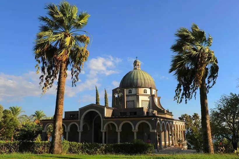 在山上耶稣论八福的地方,建起了一座教堂,建筑呈八角形,有八种颜色的玻璃窗,标志着八种福。用当地的黑色玄武岩建成,只有周边的圆拱用拿撒勒的白色岩石所造,四周环绕着一圈白色石柱,是用罗马的石灰制成。站在石柱围成的回廊上,近处是美丽的花园,远处则可眺望加利利湖。