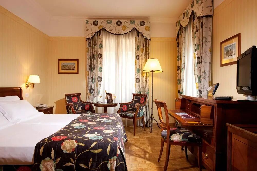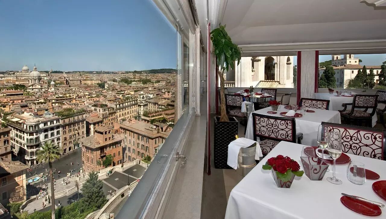 是罗马一间相对较大的私人豪华酒店,在西班牙台阶的顶端,占领绝佳位置。从酒店顶层的餐厅和露台上,可以看到大半个罗马,梵蒂冈也尽在眼帘。虽然也可以坐车走山路直接到酒店,但是每天能沿西班牙台阶,绕着四处散坐在台阶上的游客爬上来,也别有一番趣味。酒店有70个各类房间。