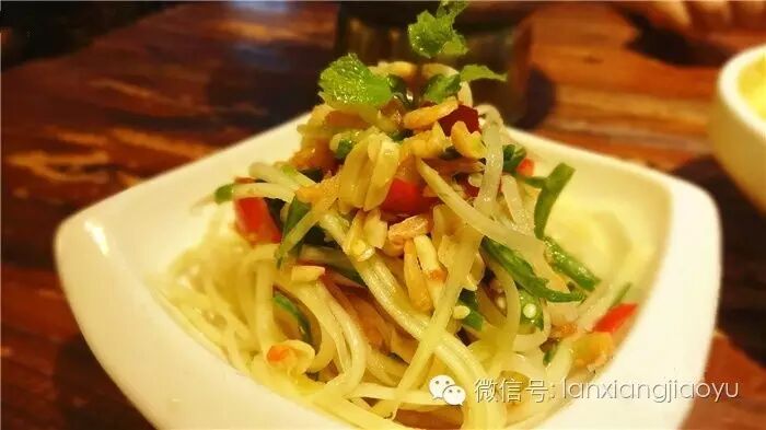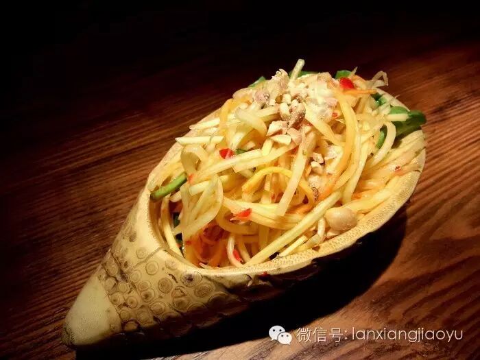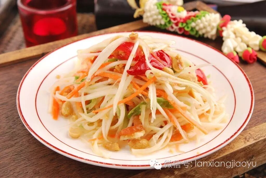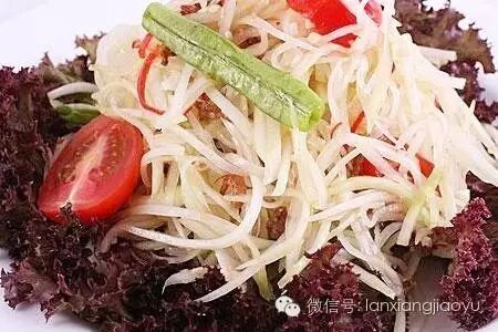 青木瓜沙拉(SOM DOM)是泰国人很喜欢的一道开胃小菜,入口酸、甜,随后以辣椒带出青木瓜的鲜脆口感,搭配生菜与花生颗粒的嚼感,让人一吃就胃口大开。不过点这道菜时要记得,由于传统的作法都会加上鱼露、虾酱与蒜头,因此在点菜时只要特别注明这些东西不吃就行了。虽然少了虾酱与鱼露的调味....