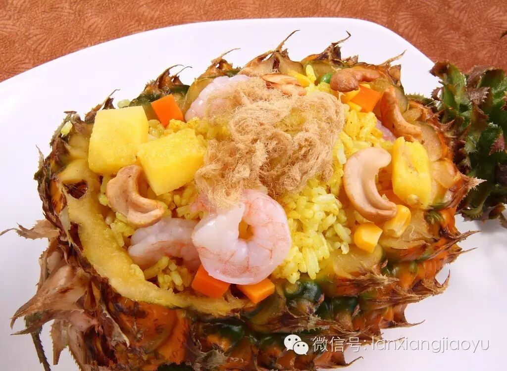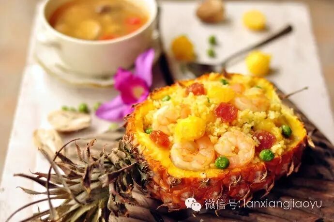 泰式菠萝炒饭运用泰国香米的香气,搭配菠萝以及什锦蔬菜等大火快炒,咸咸酸酸甜甜的口感,才吃一口就会让人食欲大开,撘配腰果一起入口,口感层次丰富,相当值得推荐!尤其把饭装在菠萝里一起上桌,视觉效果很棒!