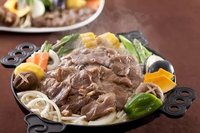 成吉思汗烤肉:烤羊肉吃法很有意思,用的是头盔型的烤架,中间放上羊脂,随着脂肪的融化,整个烤架上就被涂上了油,再放上切片的羊肉,用洋葱和葱段去膻味。考出来的羊肉鲜嫩可口。
