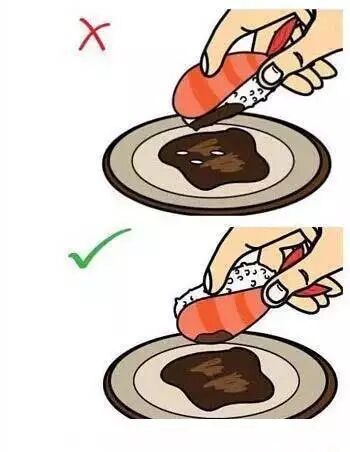 吃寿司蘸酱油的时候,要用有料的那一面去蘸,而不是用米粒那一面蘸。