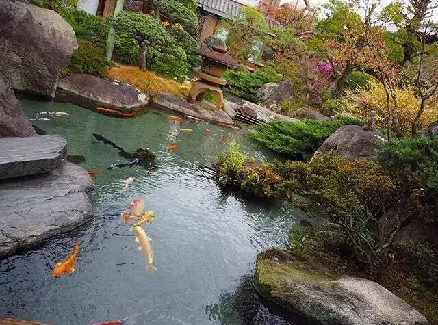 「銘石の宿かげつ」以8000坪的超大庭院,和里面的8000多条锦鲤鱼著名。里面还有从全国各地收集的奇石和铭石,园内的设计也集日本庭院设计之精粹,四季的景色都在变迁,颜色鲜艳的鲤鱼漫游其间,无论何时都体验日式风格的美景。