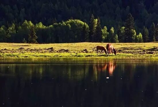 鸭泽湖身处喀纳斯景区内,因湖中有许多野鸭而得名。夏天有成群野鸭、大雁在湖区栖息,繁衍生息,十分壮观。如今这里因河水改到,变成了一大片沼泽湿地,与湿地相接的是大片的河谷草原,草原上几只闲适的牛在慢慢地游走觅食,风景清幽而动人。