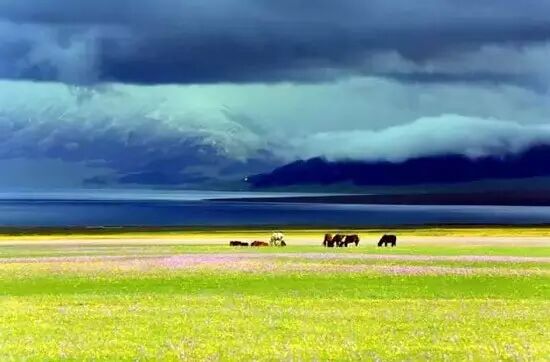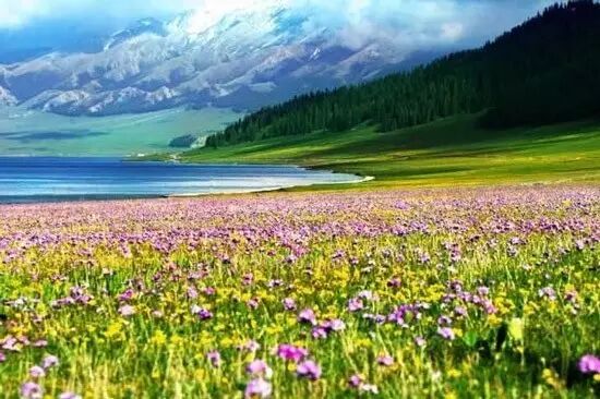 赛里木湖位于北天山山脉的群山中,在新疆博州境内,距离乌鲁木齐车程大约600公里,是雪山融雪汇聚而成的高山湖泊。雪水融化而成的湖水清澈蔚蓝,湖的一边是连绵不绝的天山山脉,另一边是广袤无垠的高山草原,每年到了六七月份,湖畔的草原就会开出各色的野花,映衬着蔚蓝的湖水和水面上雪山的倒影,人间仙境应该就是这个模样吧。