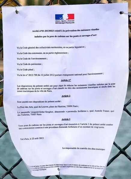 “垮塌事件”发生后,巴黎市政府推出“爱,无锁”的宣传活动,号召情侣们在桥上留影自拍,并将照片上传到该活动的官方网站上,从而取代在桥上挂爱情锁的习惯(其实兜售挂锁的小贩可以改卖自拍杆)。