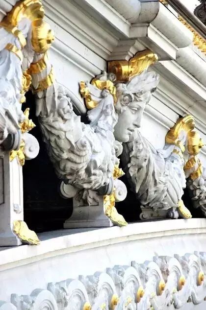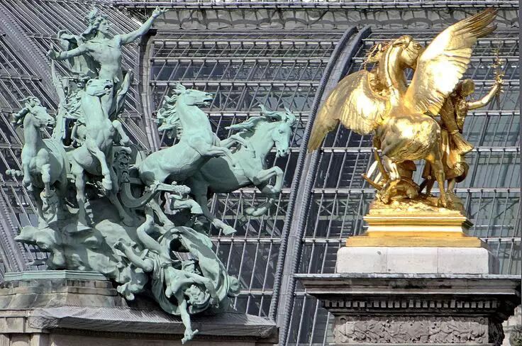亚历山大三世桥上镀金雕像和大皇宫上的青铜雕像相映成趣