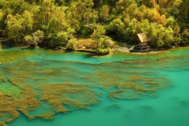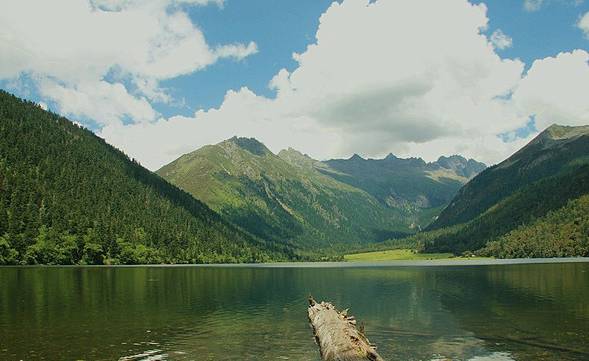 伍须海被当地人喻为“仙女梳妆的明镜”,原始森林和宽阔的草甸环绕湖泊,湖水碧绿透明,环境幽静。从夏到秋,周围百花盛开,争奇斗艳。古树盘根错节,藤枝攀延缠绕,杜鹃树伸向湖面,使伍须海显得原始、古朴,置身其间,仿佛进入仙境。
