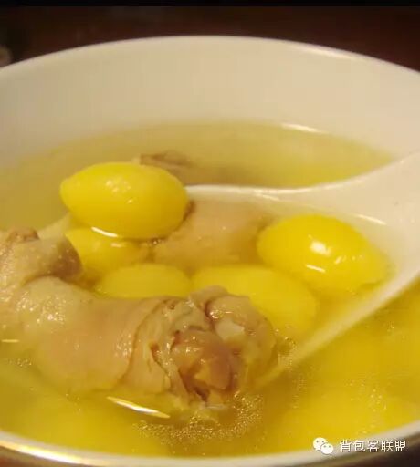 白果炖老鸭桂林餐馆里的“拳头菜”,主要原料是产在桂林共安,灵川一带的白果(银杏)和老鸭,用文火清炖而成,其特点是汤微苦,果香肉甜,营养丰富,四季皆宜。白果性凉,老鸭清火,所以白果炖老鸭即是一道可口的菜肴,又是一种滋补五脏、开胃生津、化痰止咳,润肺益气的上好补品。