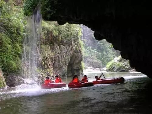 野洞河发源于朱家山原始森林,野洞河漂流的最大特色在于漂流中途会穿过一个120米长的溶洞,十分神秘 。洞中有瀑布,天窗,造型奇特的钟乳石等景观。乘橡皮舟穿洞漂游,伸手可触到较低的钟乳石,还能感受到洞中雨淋的刺激,堪称最奇特的漂流姿势。
