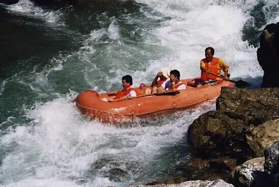 黄果树漂流自天星桥景区星峡飞瀑至郎弓景区,全程约6公里,沿途属典型的喀斯特地貌,全程水位落差30多米,激流险滩达12处之多,单个险滩最大落差达4米多,急流直下、浪遏飞舟让你惊心动魄。漂流船在河流中起伏跌宕,高歌猛进,尽显勇士风范。