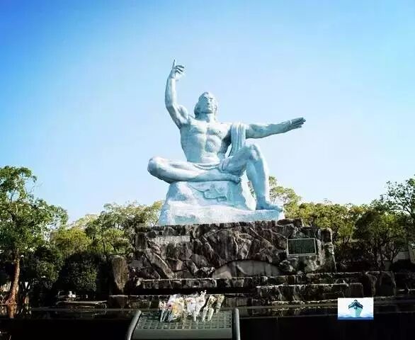 青色的和平祈念雕像右手指着天空,左手向一旁平伸,表示没有原爆的威胁世界才得以享受和平。